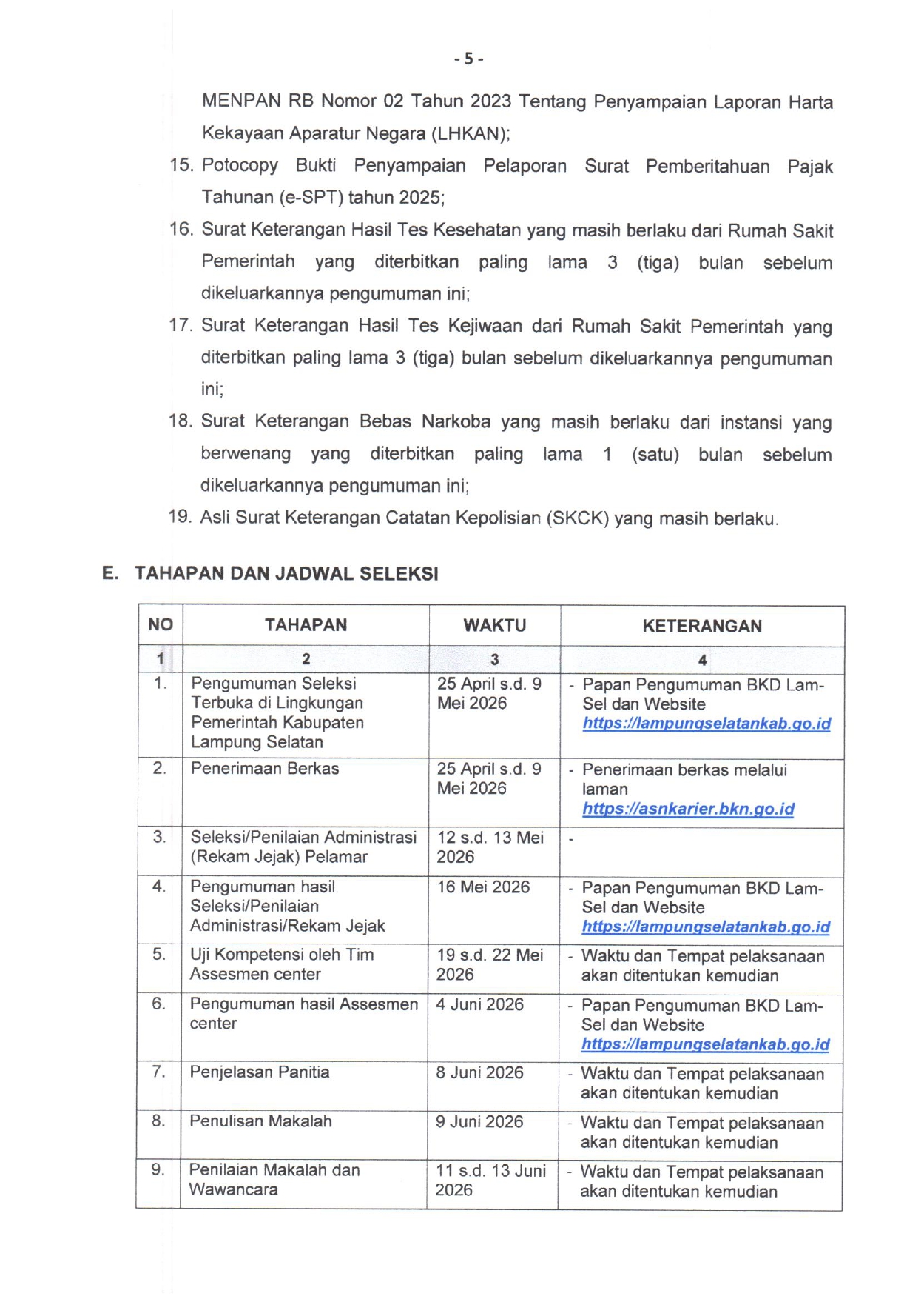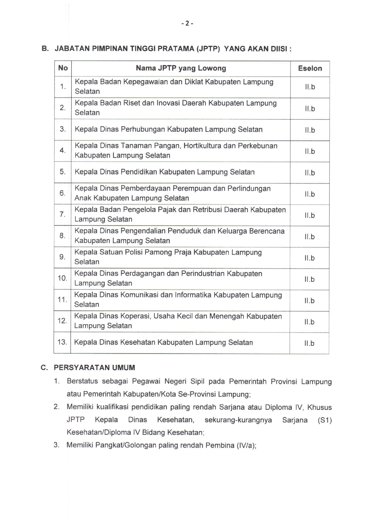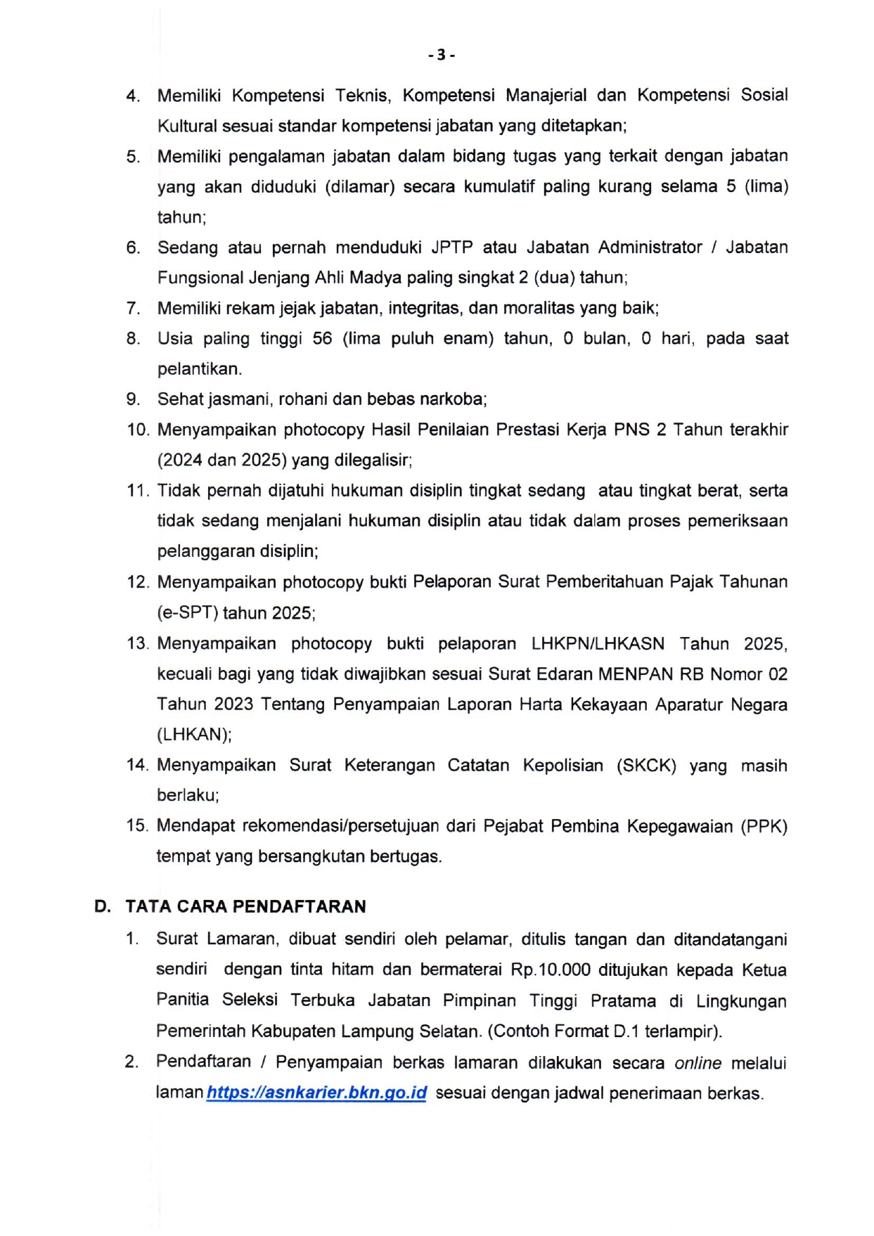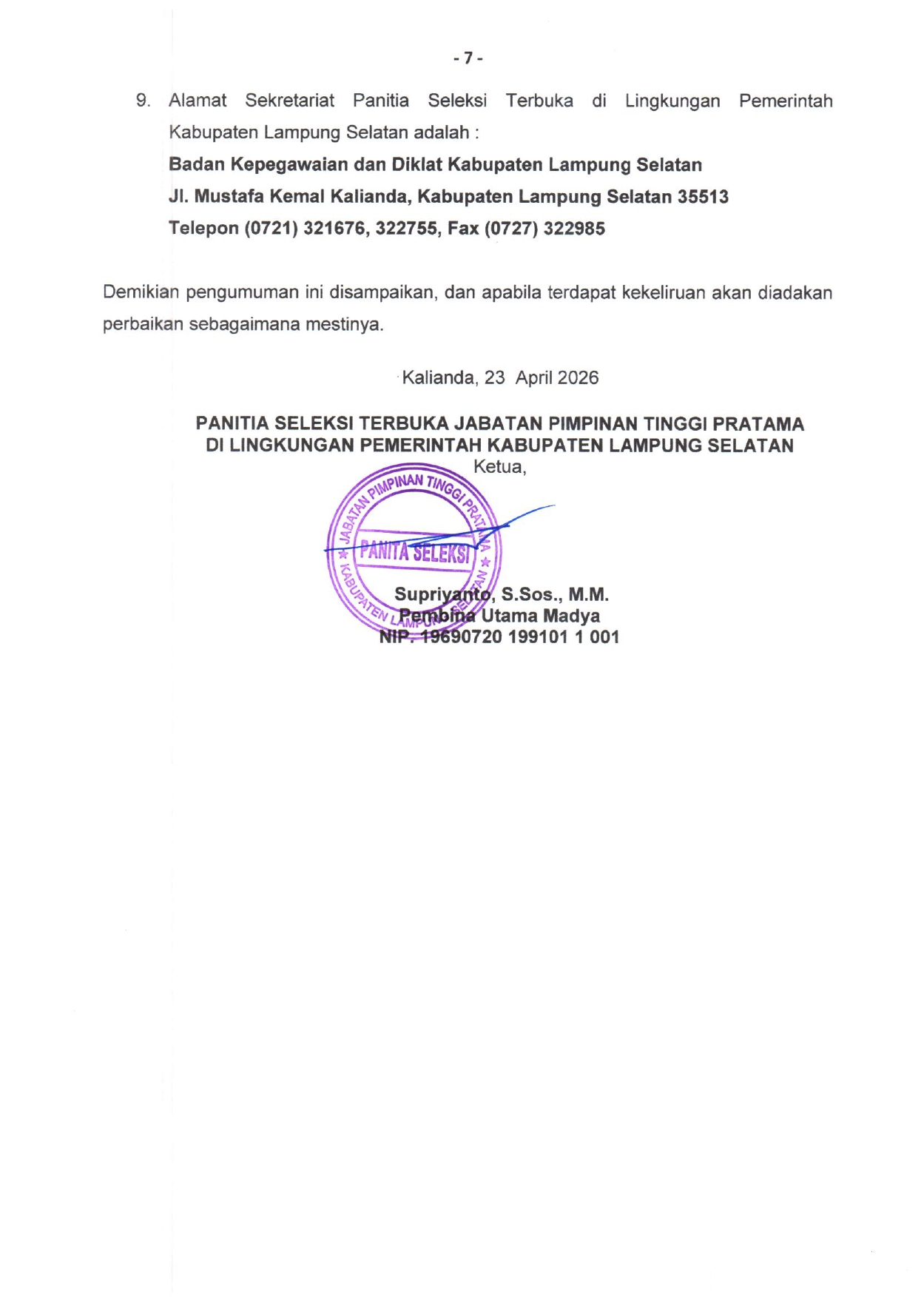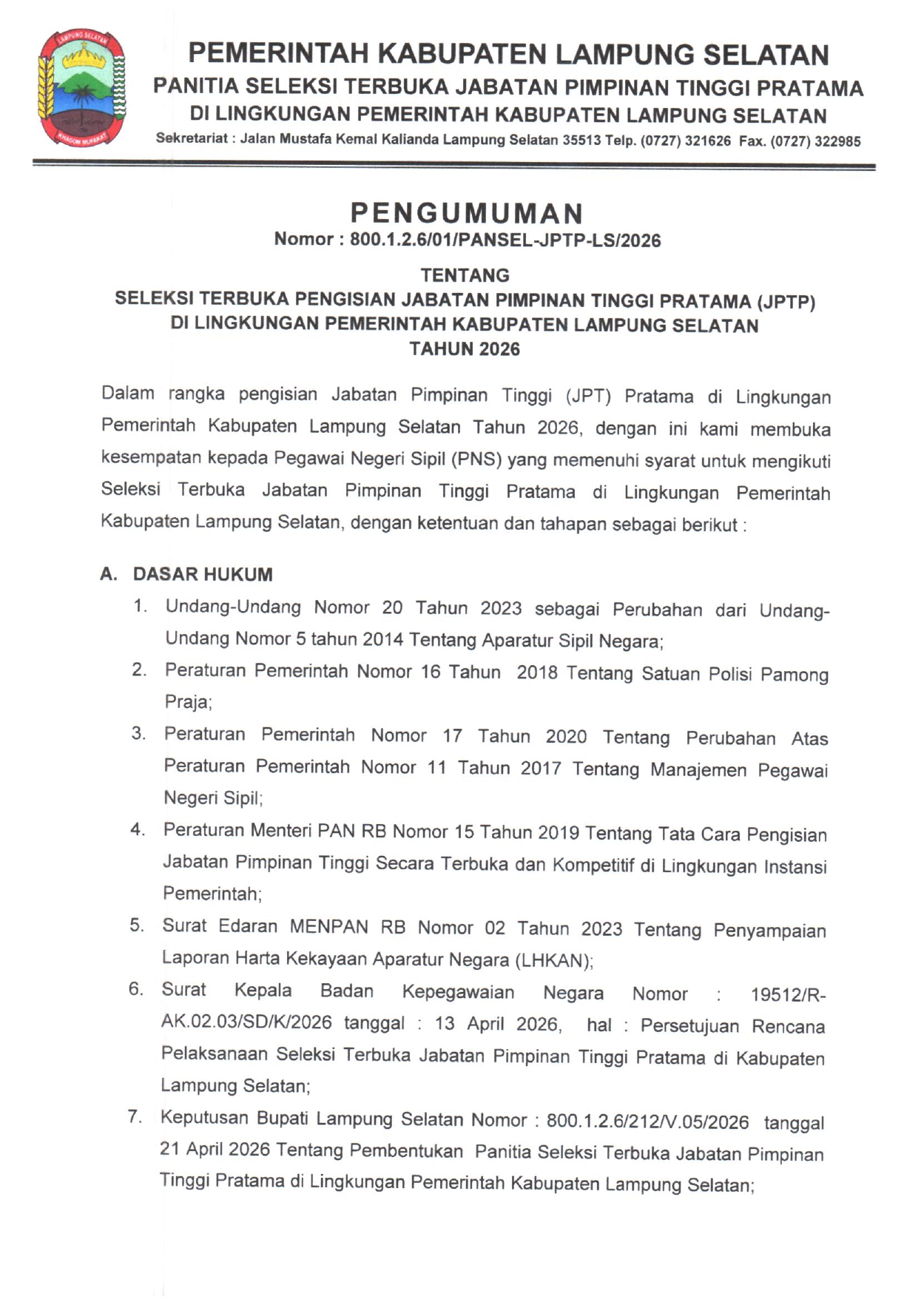 PENGUMUMAN SELEKSI TERBUKA PENGISIAN JABATAN PIMPINAN TINGGI PRATAMA DI LINGKUNGAN PEMKAB LAMPUNG SELATAN TAHUN 2026